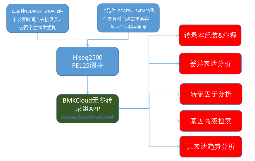LE品種杏 內(nèi)果皮薄、柔軟、韌性高 JG品種杏 內(nèi)果皮厚、堅(jiān)硬、韌性低 取樣部位: 去核果實(shí) 測(cè)序平臺(tái): Illumina HiSeq? 2500 PE125測(cè)序