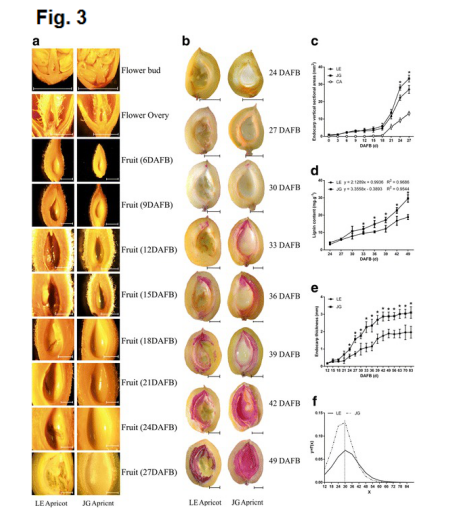 b)圖3展示了兩種品種杏的內(nèi)果皮在果實(shí)發(fā)育的不同階段各項(xiàng)指標(biāo)的比較,包括內(nèi)果皮木質(zhì)素含量(圖3d)、內(nèi)果皮厚度(圖3e)、內(nèi)果皮界面面積(圖3c)、內(nèi)果皮木質(zhì)素積累直觀觀察(圖3b)、內(nèi)果皮顯微鏡直觀觀察結(jié)果(圖3a)。 圖3a顯示,LE品種與JG品種的內(nèi)果皮在15DAFB之前形態(tài)上基本無(wú)差異,15DAFB之后,LE品種的內(nèi)果皮開始出現(xiàn)破裂缺失,隨著發(fā)育階段往后推移,破裂程度越來(lái)越大。 圖3e顯示,LE品種與JG品種的內(nèi)果皮在30DAFB之前厚度上并無(wú)差異,之后在厚度上,兩種品種出現(xiàn)顯著差異。 圖3d顯示,LE品種與JG品種的內(nèi)果皮中木質(zhì)素含量也在24DAFB之后出現(xiàn)顯著差異。