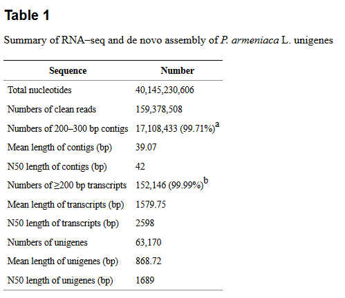 a)測(cè)序取樣部位 : 去核后的果實(shí),每個(gè)品種兩個(gè)生物學(xué)重復(fù) 測(cè)序取樣時(shí)間點(diǎn) : 根據(jù)上一部分的表型觀察結(jié)果,LE品種內(nèi)果核在15DAFB時(shí)出現(xiàn)裂縫,在24DAFB時(shí),裂縫程度開始快速增大,因此,該mRNA測(cè)序項(xiàng)目選擇了15DAFB和24DAFB兩個(gè)時(shí)間點(diǎn)樣本 b)轉(zhuǎn)錄本組裝:測(cè)序共得到~20Gbase clean data,使用Trinity軟件組裝得到63,170條unigene,unigene N50大小1689bp,詳細(xì)組裝結(jié)果參見表1。