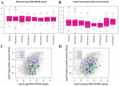 為了探索mRNAs甲基化是否與翻譯有關(guān),作者把mRNA甲基化數(shù)據(jù)與Smits等人已發(fā)表的轉(zhuǎn)錄組和蛋白組數(shù)據(jù)進行了整合。通過BLAST分析,在RNA/蛋白數(shù)據(jù)中找到了723個m6A修飾mRNAs的信息。GV期或者MII期卵母細胞中高m6A峰的RNA水平(log10 RNA RPKM值)比總RNA高(在卵或者胚胎中),但是蛋白水平(log10 protein amount / fmol)比總蛋白水平低(Figure 2)。與高度甲基化的mRNAs相比,低甲基化RNAs顯示出非常高的表達水平(Figure 3)。這些結(jié)果說明在卵母細胞或早期胚胎中,m6A修飾可能與mRNA翻譯有關(guān)。
