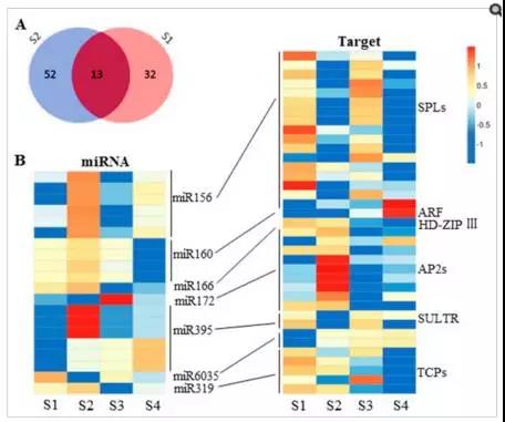 c) IDEG6軟件分析( |FC| >2)進(jìn)行差異表達(dá)分析,兩個時間點(diǎn)在兩個品系間分別檢測得到45、65個差異表達(dá)microRNA。值得注意的是,如圖7所示,除了miR1140 與miR827, 抽薹時間點(diǎn)上的所有已知 差異表達(dá)miRNAs 均在 品系Purler中上調(diào),這其中包括3個miR156 家族 與6個 miR395 家族microRNA,相反,花發(fā)育早期時間點(diǎn)上的所有差異表達(dá)miRNAs 均在 品系Purler中下調(diào)。