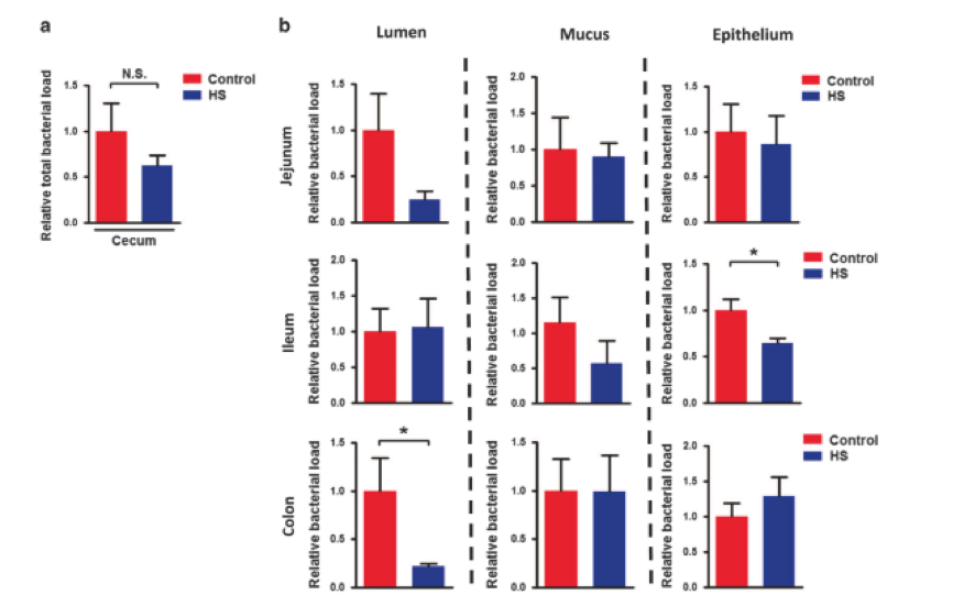 首先,研究人員檢查HS攝入是否會(huì)影響腸道細(xì)菌。慢性HS喂養(yǎng)后,盲腸中的總細(xì)菌負(fù)荷略有下降,但無顯著變化(圖1a)。慢性HS喂養(yǎng)后,回腸上皮(圖1b)和結(jié)腸腔內(nèi)(圖1b)的細(xì)菌負(fù)荷也降低。慢性HS處理顯著降低厚壁菌門和提高擬桿菌的水平,這表明細(xì)菌組合物在HS攝入后發(fā)生改變。