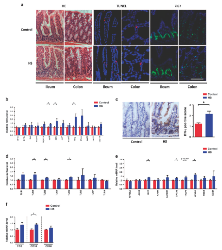 為了研究HS攝入如何影響腸道微環(huán)境,研究人員將HS組的細(xì)菌組成與對(duì)照組相比,在HS處理后,盲腸中Actinobacteria,F(xiàn)irmicutes和Bacteroidetes在門水平和Actinobacteria以及Clostridia和Bacteroidia的百分比顯著不同。unweighted uniFrac分析結(jié)果顯示HS和對(duì)照組分別聚集(圖2b)。進(jìn)一步分析顯示,HS和對(duì)照組在回腸粘液層分別聚集(圖2c),而對(duì)照組和HS組形成兩個(gè)聚類,分離趨勢(shì)明顯在結(jié)腸粘液層(圖2d)。研究結(jié)果表明,慢性HS喂養(yǎng)可能導(dǎo)致腸道生態(tài)失調(diào),細(xì)菌計(jì)數(shù)和微環(huán)境組成的變化也證明了這一點(diǎn)。