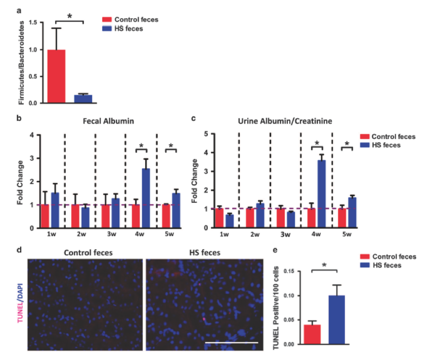 最后,為了進(jìn)一步證明腸道微生物群是腎損傷發(fā)展的上游因素,進(jìn)行了糞便微生物群移植實(shí)驗(yàn)。喂食正常飲食(不是高鹽)的兩組小鼠口服來自對(duì)照和HS處理的小鼠的糞便。8周后,接受對(duì)照糞便的對(duì)照小鼠的盲腸壁Firmicutes/Bacteroidetes比例(其是微生物群組成改變的主要標(biāo)志)顯著高于接受HS糞便的HS小鼠,其為 與研究人員之前的數(shù)據(jù)一致,表明HS喂養(yǎng)降低了盲腸中的Firmicutes / Bacteroidetes比例,并證明該糞便微生物群移植實(shí)驗(yàn)是成功的(圖7a)。此外,如圖7b和c所示,給藥后4周,由糞便白蛋白含量監(jiān)測(cè)的腸道通透性在接受HS喂養(yǎng)糞便的小鼠中顯著增加,并且重要的是,尿白蛋白/肌酸酐比率(目前研究中觀察到的腎功能障礙的主要表型)在移植后4周接受HS喂養(yǎng)的糞便的小鼠中也顯著增加。最后,與對(duì)照小鼠相比,HS糞便移植小鼠中腎臟凋亡細(xì)胞的數(shù)量顯著增加(圖7d和e)。這些數(shù)據(jù)進(jìn)一步表明,HS喂養(yǎng)引起的腸道生態(tài)失調(diào)是腎損傷和功能障礙的原始誘因。