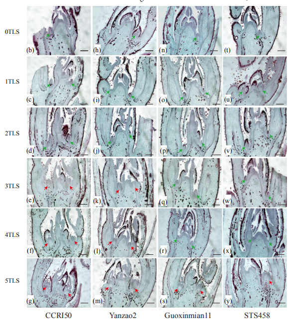 陸地棉(Gossypium hirsutum L.)是世界上最重要的纖維作物。在我國黃河流域和長江流域棉區(qū),實現(xiàn)早熟棉在小麥或者油菜后直播可以提高復種指數(shù)。而在西北內陸棉區(qū),春季氣溫低,秋季枯霜早,早熟棉既能提高棉花的霜前花率,還可以改善棉花品質。花芽分化是影響短季棉品種早熟的重要性狀,是棉花現(xiàn)蕾期、開花期和成鈴期發(fā)育的基礎,花芽分化直接影響開花時間?;ㄑ糠只侵参飶臓I養(yǎng)生長向生殖生長過渡的標志。當進入生殖生長時,側芽變成花芽,花芽發(fā)育成果枝。果枝分化決定了開花量、生殖能力和棉花產量。因此,早熟性狀及早熟棉品種在生產上顯得尤為重要。
