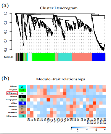 然后作者利用高分文章利器:WGCNA分析,進行數(shù)據(jù)深度挖掘和整理,推薦大家使用百邁客云平臺小工具WGCNA模塊,可以出來和作者同樣高大上的圖片。