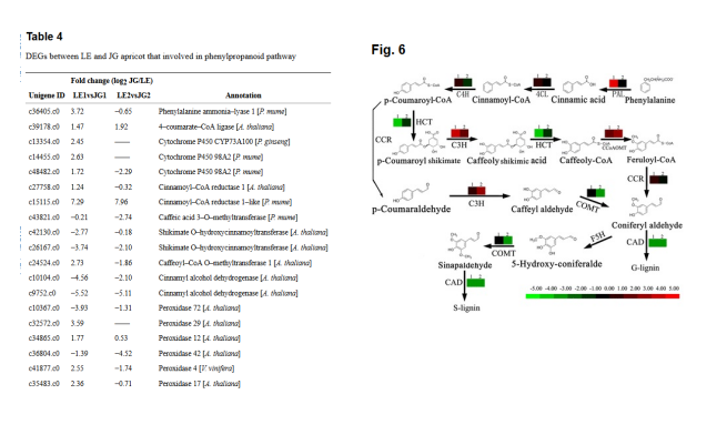 a)LE品種內(nèi)果皮破裂與發(fā)育不全是一個(gè)非常復(fù)雜的表型,與眾多的代謝通路相關(guān),但類苯基丙烷相關(guān)通路是眾多代謝通路中已經(jīng)證實(shí)的非常重要的一個(gè)。該項(xiàng)目中對(duì)兩個(gè)品種在兩個(gè)時(shí)間點(diǎn)的差異表達(dá)基因的KEGG富集分析結(jié)果也證實(shí)了上述事實(shí),所以差異基因顯著富集于類苯基丙烷代謝、合成等通路。類苯基丙烷相關(guān)通路相關(guān)差異表達(dá)基因見列表4與圖6。