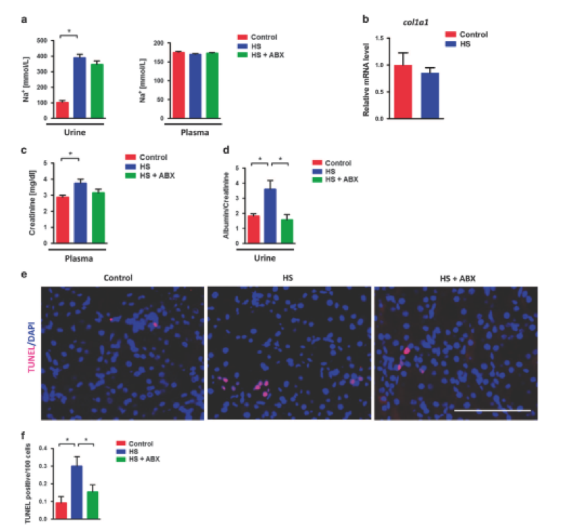 為了進(jìn)一步闡明HS攝入后腸道生態(tài)失調(diào)和腎損傷之間的關(guān)系,給小鼠喂養(yǎng)多粘菌素B和新霉素??股亟o藥確實(shí)恢復(fù)了HS飼喂誘導(dǎo)的回腸Ifn-γ過表達(dá),通過糞便白蛋白和FD-4滲透監(jiān)測(cè)腸道泄漏,以及通過血漿內(nèi)毒素水平和腎臟16s / 18s比率監(jiān)測(cè)的細(xì)菌移位,通過尿和血漿Na +濃度測(cè)量,抗生素不改變鈉負(fù)荷(圖5a)。雖然8周HS喂養(yǎng)并未引起纖維化等進(jìn)展性腎損傷,但由col1a1 mRNA水平監(jiān)測(cè)(圖5b),HS喂養(yǎng)增加了血漿肌酐水平。更重要的是,與對(duì)照組小鼠相比,HS-喂養(yǎng)小鼠腎功能障礙的主要標(biāo)志物尿白蛋白/肌酐比率顯著增加,抗生素治療幾乎可以完全恢復(fù)腎功能(圖5d)。另外,TUNEL染色顯示抗生素施用可以降低HS誘導(dǎo)的凋亡細(xì)胞的升高(圖5e和f)??傊?,該數(shù)據(jù)表明,抗生素治療能夠改善腸道滲漏和HS喂養(yǎng)引起的早期腎損傷。