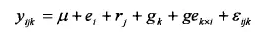 利用方差分析計算各性狀的環(huán)境方差、重復(fù)方差(有試驗重復(fù))、遺傳方法、基因型與環(huán)境互作方差、誤差方差和遺傳力,并估計哥哥變量的遺傳效應(yīng)。方差分析的線性模型為: